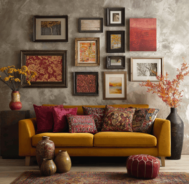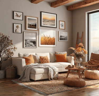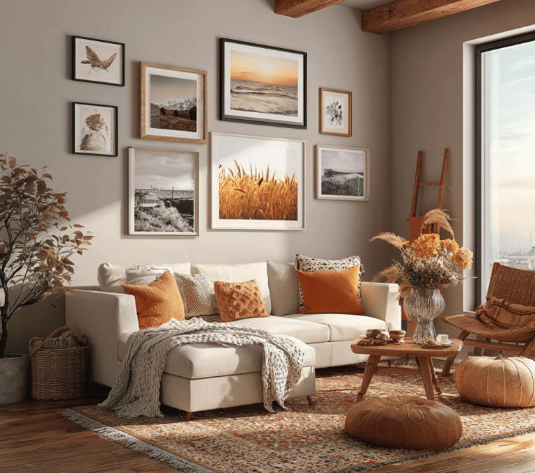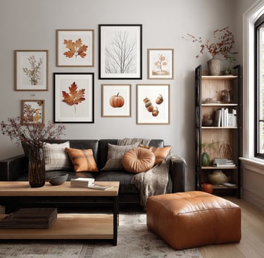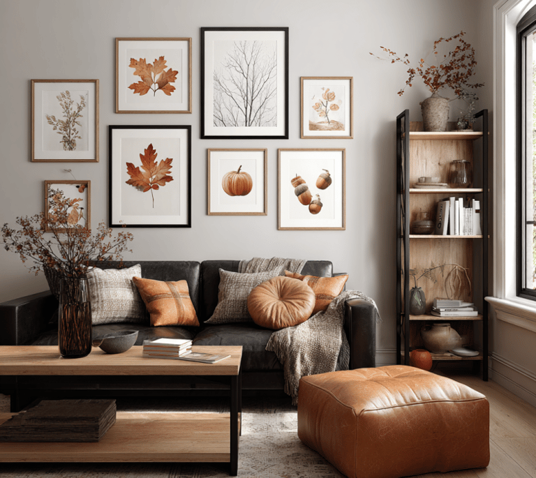 Color pulls the whole look together. Think about the shades you already see in fall: deep reds, mustard yellows, browns that feel rustic and warm. If you repeat those tones across your pieces, the wall will feel balanced even if the art styles are totally different. And don’t forget—this is your space. Slip in prints that fit your personality too, not just the season.