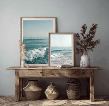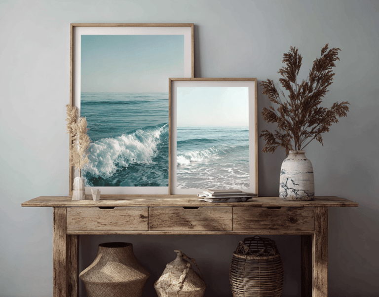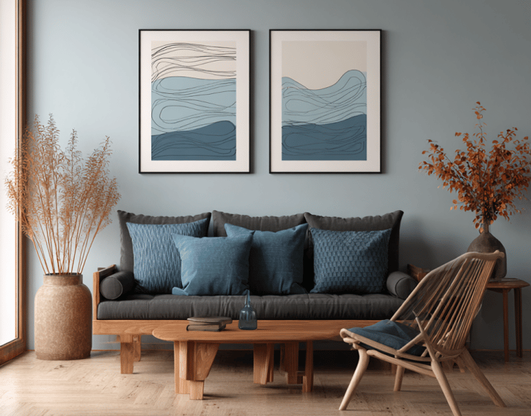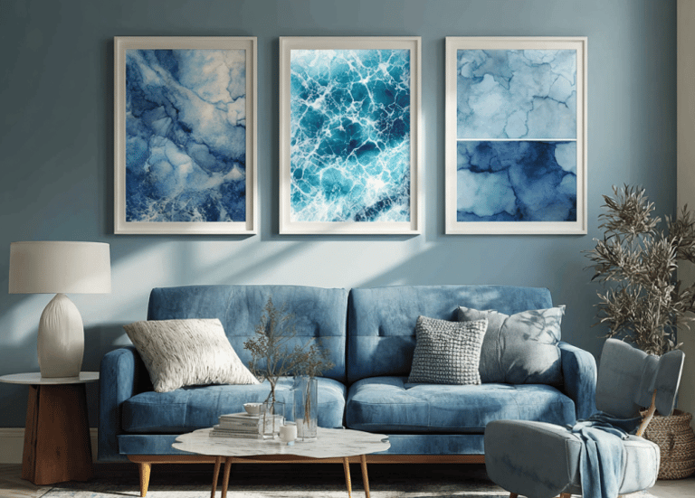 Watercolor art has a whole different mood. Soft washes of blue—sometimes indigo, sometimes pale sky—create that dreamy, almost floating feeling. Pair them with light frames and suddenly the room feels calm, breezy, and pulled together without much effort at all.