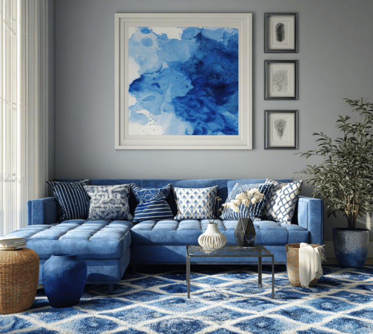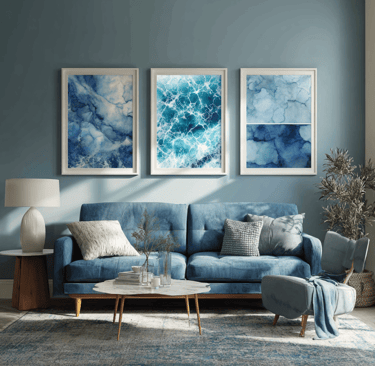 Photographic art is one of the easiest ways to bring mood into a space. When the subject leans into shades of blue—whether it’s a misty mountain, a stretch of ocean, or even an abstract detail—you get a sense of calm that feels natural. The beauty of photography is that it freezes a moment, and when framed, that moment becomes part of your living room’s atmosphere.