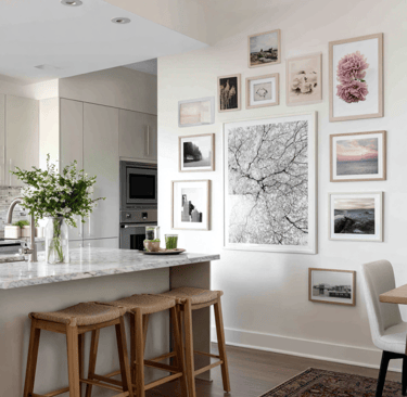 Start by deciding on a theme that resonates with your kitchen vibe. Whether it's vintage food posters, botanical prints, or vibrant abstracts, sticking to a theme helps create a cohesive look. Printing your favorite artworks in a consistent color palette can also add elegance to your space.