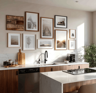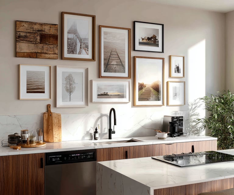 One great way to jazz up your kitchen gallery wall is by mixing different frame styles. Don't hesitate to combine sleek modern frames with rustic wooden ones. This playful contrast can add character and warmth. You might even use washi tape for a fun border effect—perfect for a casual kitchen aesthetic.