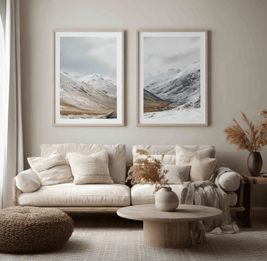 Seasonal art keeps things interesting year-round. Swap in autumn leaves when October rolls around, hang snowy landscapes in the winter, then switch to florals in spring. Because printables are affordable, you can rotate them as often as you like. It’s the easiest way to keep your living room vibe fresh without overthinking it.