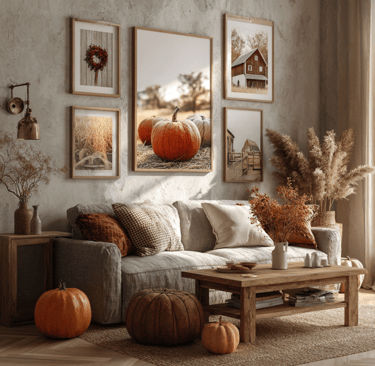 Rustic farmhouse prints always nail the season. Pumpkins, hay bales, maybe an old barn in the background—classic fall vibes. Those deep browns, oranges, and reds instantly warm up a space. Even just one piece hung above a couch or mantel changes the whole feel of the room..
