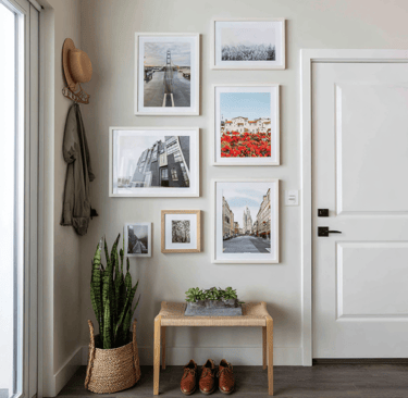 If you don’t have wide walls to work with, think up instead of out. A vertical layout pulls the eye upward, making the room look taller. Stack frames in columns or a loose zigzag. It’s a small trick, but it works every time—and it keeps the space from feeling boxed in.