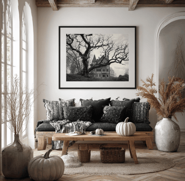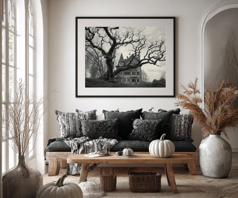 Another idea: use your own camera. Foggy streets, twisted tree branches, or houses lit up with glowing jack-o’-lanterns make for incredible wall art when printed. Not only do these add atmosphere, but they also tell a story—you get to say, “Oh, I took that one myself,” which makes your Halloween setup feel way more personal.