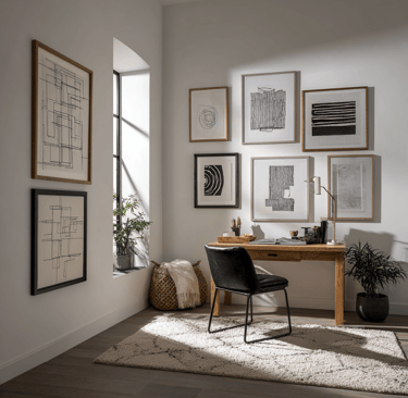 Working from home has its perks, but staring at the same plain walls all day? Not so inspiring. A quick fix: create a gallery wall. Printable art makes it affordable and flexible—you can swap things out whenever your mood changes. It’s an easy way to give the room some personality.