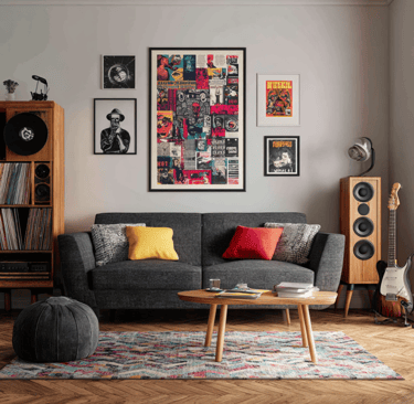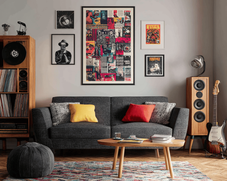 Music and movie prints add personality fast. A classic rock legend, an old Hollywood poster—stuff like that instantly makes the space feel more “you.” Mix in a couple of black-and-white ones with brighter pieces so it doesn’t look flat. Guests always notice them, and they say a lot without you saying anything.