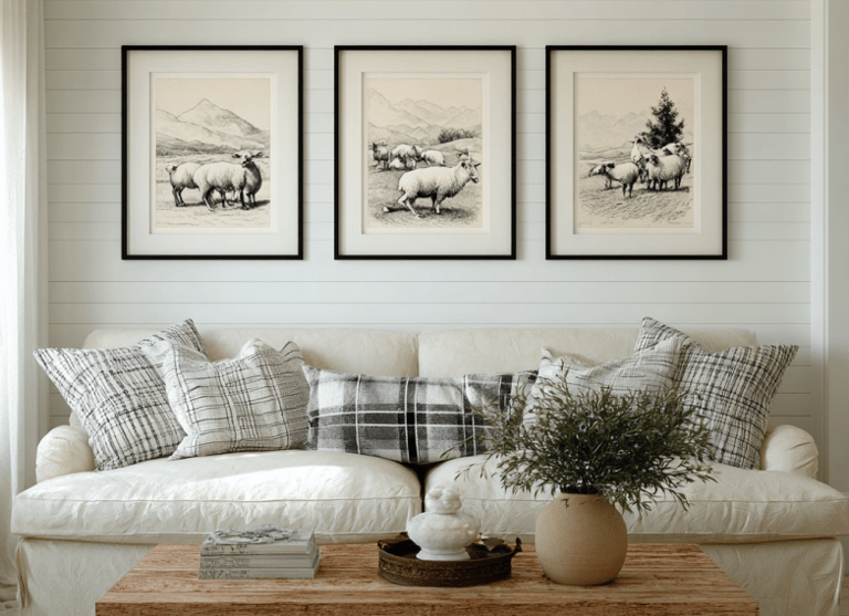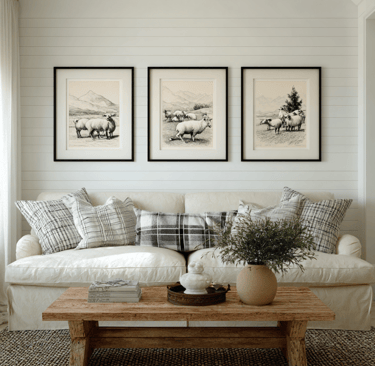 Nature belongs in farmhouse décor too. Landscapes, botanical sketches, even farm animals—these prints breathe life into a room. A mix of sizes looks collected and authentic, like pieces gathered over time. Hang them together for a gallery wall that feels lived-in and personal.