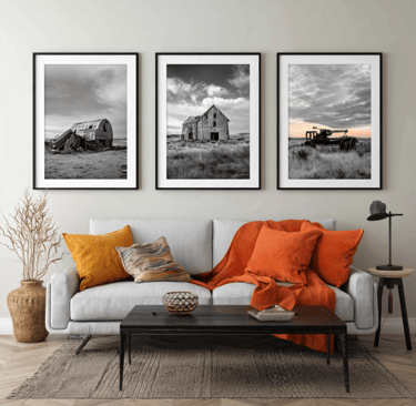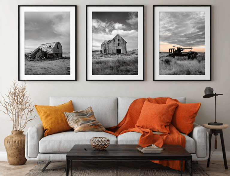 Black and white photography adds another layer. Barns, fields, weathered fences—simple shots that look striking without color. They balance rustic charm with a touch of elegance. Bonus: they fit any color palette, so no stress about clashing with your couch.