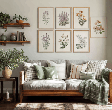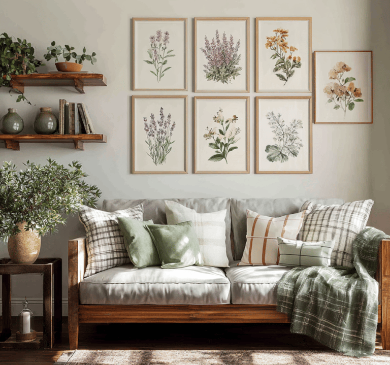 Floral prints soften the whole look. Vintage wildflowers, lavender sprigs, eucalyptus sketches—they bring an airy, organic vibe. Pair with wood frames or distressed finishes and suddenly the space feels calm but not boring. That mix of rugged and delicate is the sweet spot of farmhouse style.