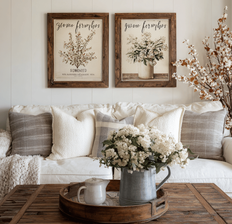 Words on the wall always hit home. Classic farmhouse quotes like “Home Sweet Home” or “Gather Here” in distressed lettering bring that welcoming feel right away. Frame one over the sofa, or scatter a few around for little reminders that the heart of the home isn’t the furniture—it’s the people in it.