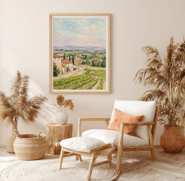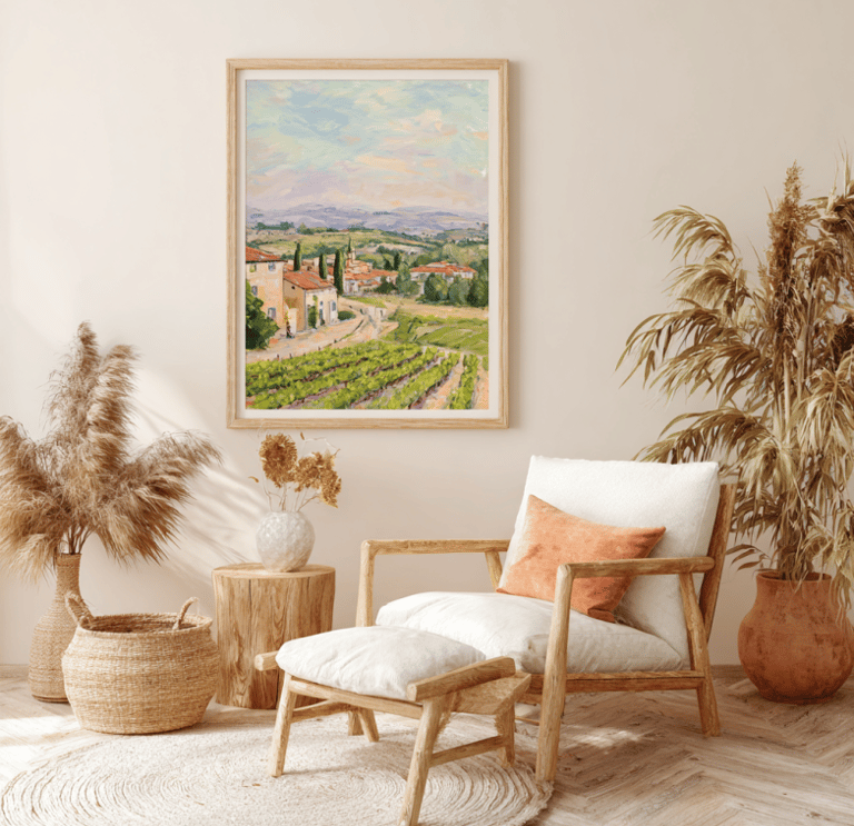 Landscapes work beautifully too. Rolling vineyards, stone cottages, quiet fields—it’s like opening a window to the French countryside. A cluster of small prints creates a gallery feel, while one large landscape can act as a peaceful focal point. Every glance takes you somewhere else, somewhere slower, calmer.