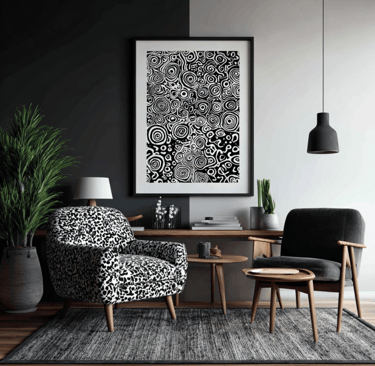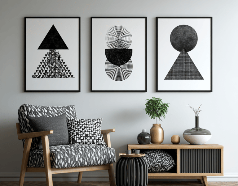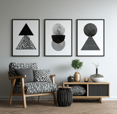 Geometric designs bring instant structure. Triangles, circles, stacked squares—done in black and white, they feel sharp and modern. A gallery wall with a few of these prints can look crisp, while one oversized piece can easily carry the whole wall. Minimalist rooms especially love this style.