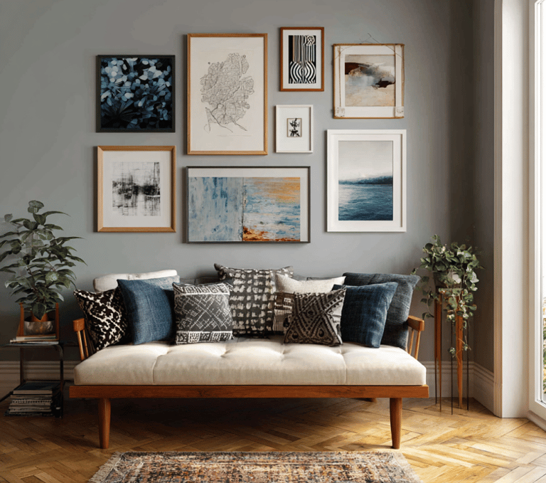 Gallery walls don’t have to be flat or uniform. Try mixing in a hanging plant, a small mirror, or even a woven wall hanging for texture. It’s okay if it looks a little imperfect—that’s what makes it feel lived-in. Your wall should look like it’s grown over time, not like it was assembled in one afternoon.