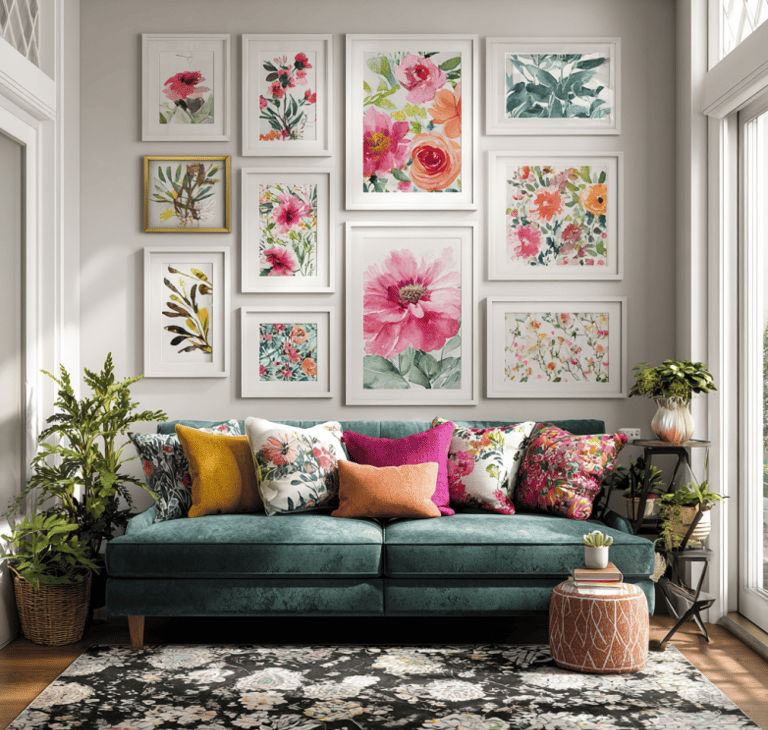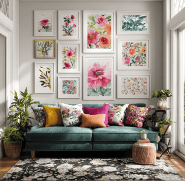 If you want a softer but still striking option, go floral. Oversized blossoms, leafy greens, or wild garden prints can completely change the tone of a room. Choose bright, oversized flowers for drama or go for smaller, delicate patterns for subtle charm. Floral gallery walls are perfect for living rooms or bedrooms that could use a little life and color.