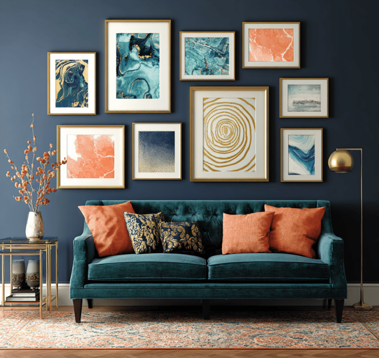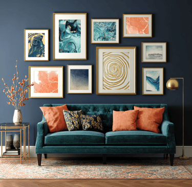 Before you start hanging frames, think about your color story. A cohesive palette ties everything together, no matter how different the prints may be. Bold hues can energize a space, while muted ones calm it down. Try combining colors that complement one another — deep blues with gold tones, or coral against soft green. The right combination makes your gallery wall look deliberate, not chaotic, and instantly adds polish to your room.
