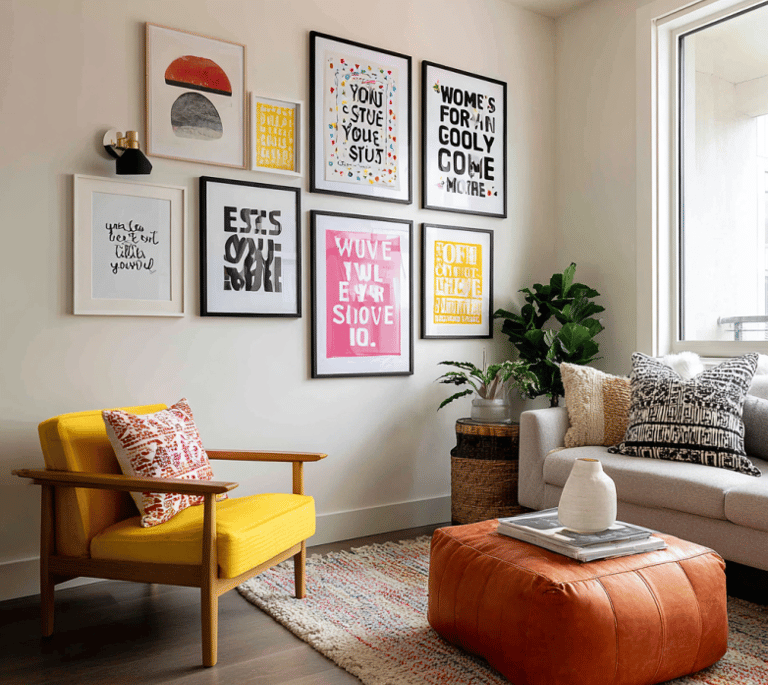 Words can be art too. Choose bold, block-lettered quotes or playful fonts that speak to your personality. You can pair a favorite motivational phrase with colorful backgrounds or mix black-and-white text pieces into a bright wall for contrast. Typography art adds attitude and emotion, especially when you choose quotes that actually mean something to you.